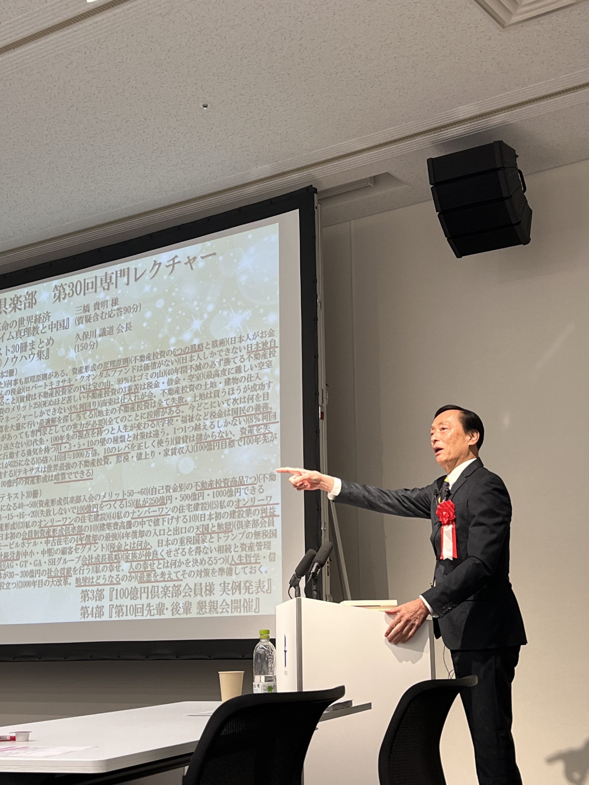 第一部では、久保川会長が倶楽部会員様それぞれの100億円資産づくりについて、具体的にどのような方法で行っていくのか。50億円・100億円の資産が何年後に出来るのか。また、次のステップとして、久保川会長自ら300億円を目指すことなどご講演頂きました。